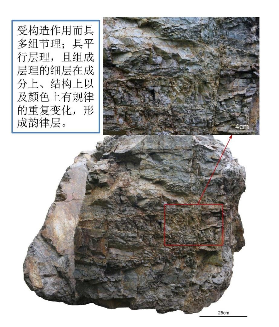 该标本为磷块岩矿石,呈黄灰色,隐晶质结构,条带状构造。矿石矿物主要为磷灰石和胶磷矿,含少量磁铁矿;脉石矿物主要为方解石、石英。断裂和节理发育,具平行层理。