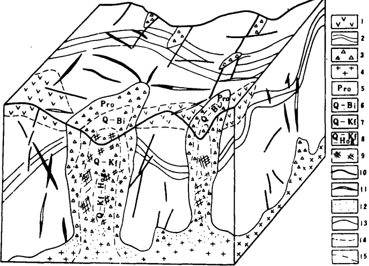 中生代华北与扬子大陆碰撞时,熊耳地体南侧的地壳板片沿马超营断裂A型俯冲到熊耳地体之下,并在熊耳地体之下发生变质脱水、熔融,使熊耳地体自南而北发育热液矿床带、花岗岩带和斑岩带。其中,热液矿床带由康山、上宫、铁炉坪等造山型金—银矿床组成,相当于CMF模式的D带;花岗岩带由五丈山、蒿坪、金山庙等岩体组成,即花山花岗岩杂岩,相当于CMF模式的G带;斑岩带由祁雨沟爆破角砾岩型金矿和雷门沟斑岩型钼矿等浅侵位岩浆岩组成,相当于CMF模式的P带。