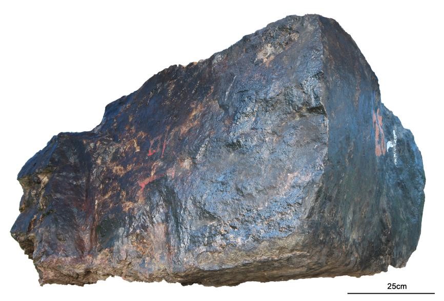 碳酸锰矿矿石,产自云南省鹤庆锰矿,标本呈灰黑色,中细粒结构,角砾状、浸染状构造。矿石矿物主要为软锰矿,呈束状、纤维状,他形粒状。脉石矿物主要有方解石,方解石主要以生物碎屑的形式存在,呈长条状、弧状、圆球状,少量呈半自形粒状。矿床成因属火山热液同生沉积加后期改造锰矿床。所属矿床产于扬子地台与三江地槽两大构造单元的过渡带,地层为上三叠统松桂组。矿床锰品位为19.12%。
