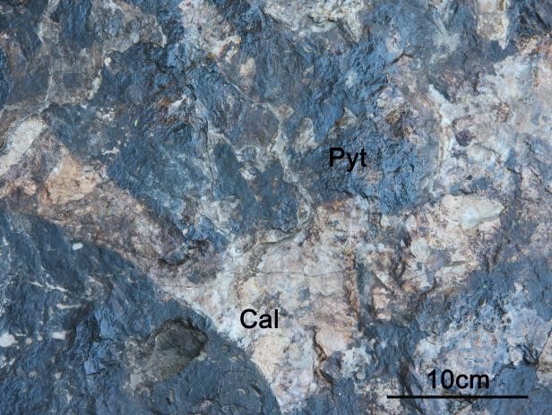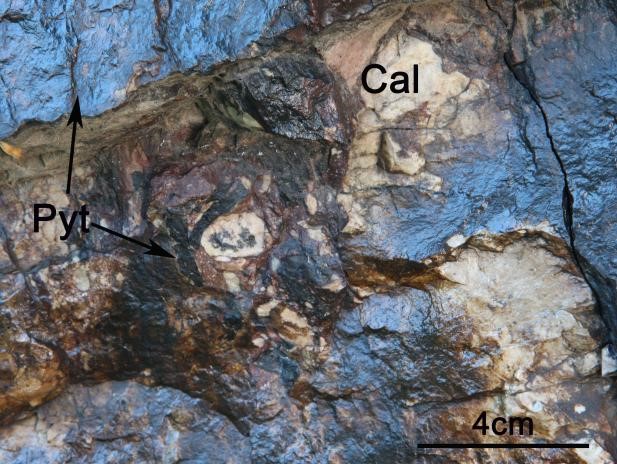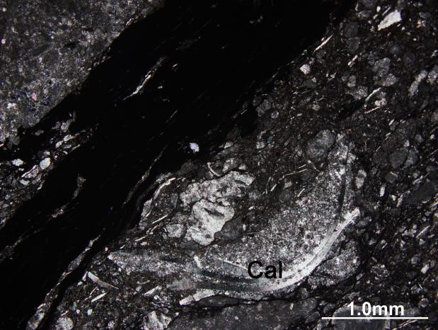 软锰矿(Pyt)呈黑色,风化后呈皮壳状。方解石质(Cal)角砾呈白色,棱角分明。