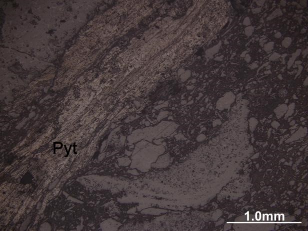 软锰矿(Pyt),呈长条状、束状,反射色呈灰色,带棕色调,周围可见方解石质(Cal)生物碎屑,呈弯曲弧状、细条状、他形粒状分布。