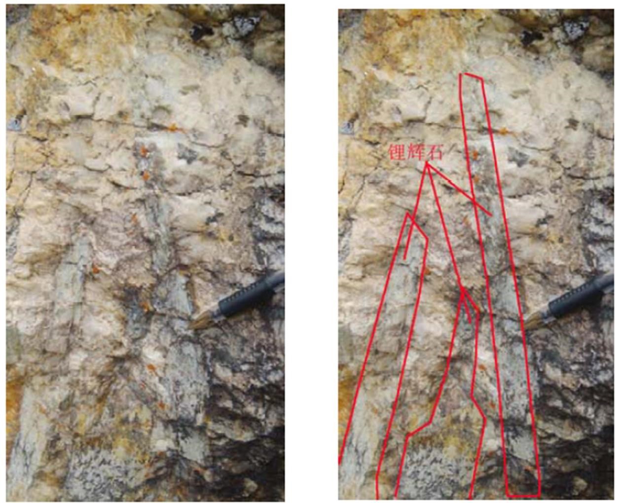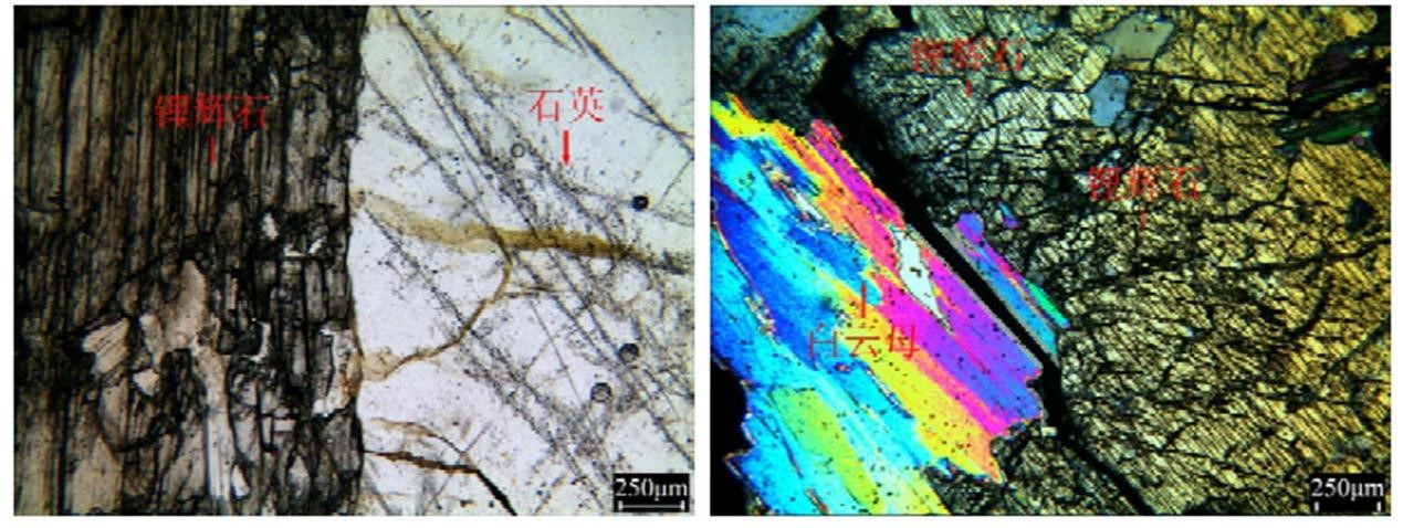 该矿区产出的锂辉石,呈板柱状半自形—自形结构