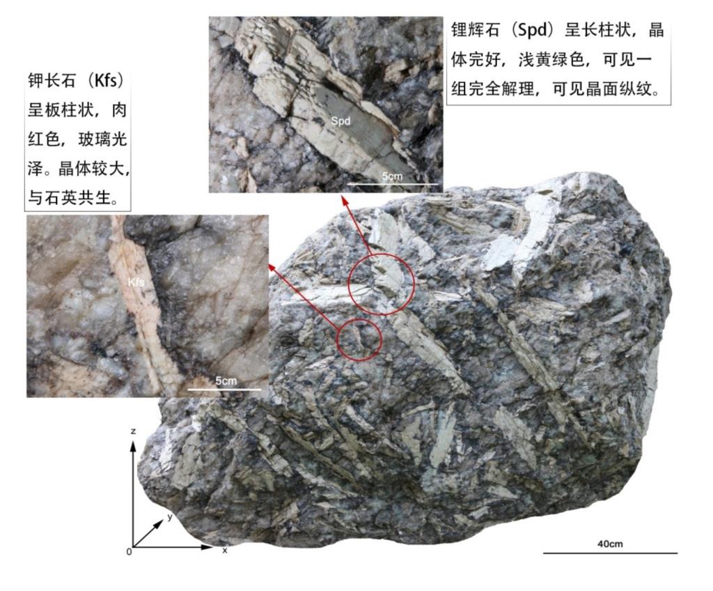 该标本为花岗伟晶岩型锂铍矿矿石,呈似斑状、伟晶状,薄片状结构,碎裂块状构造,主要矿石矿物为锂辉石、钾长石。可可托海稀有金属矿是世界罕见的超大型稀有金属矿。