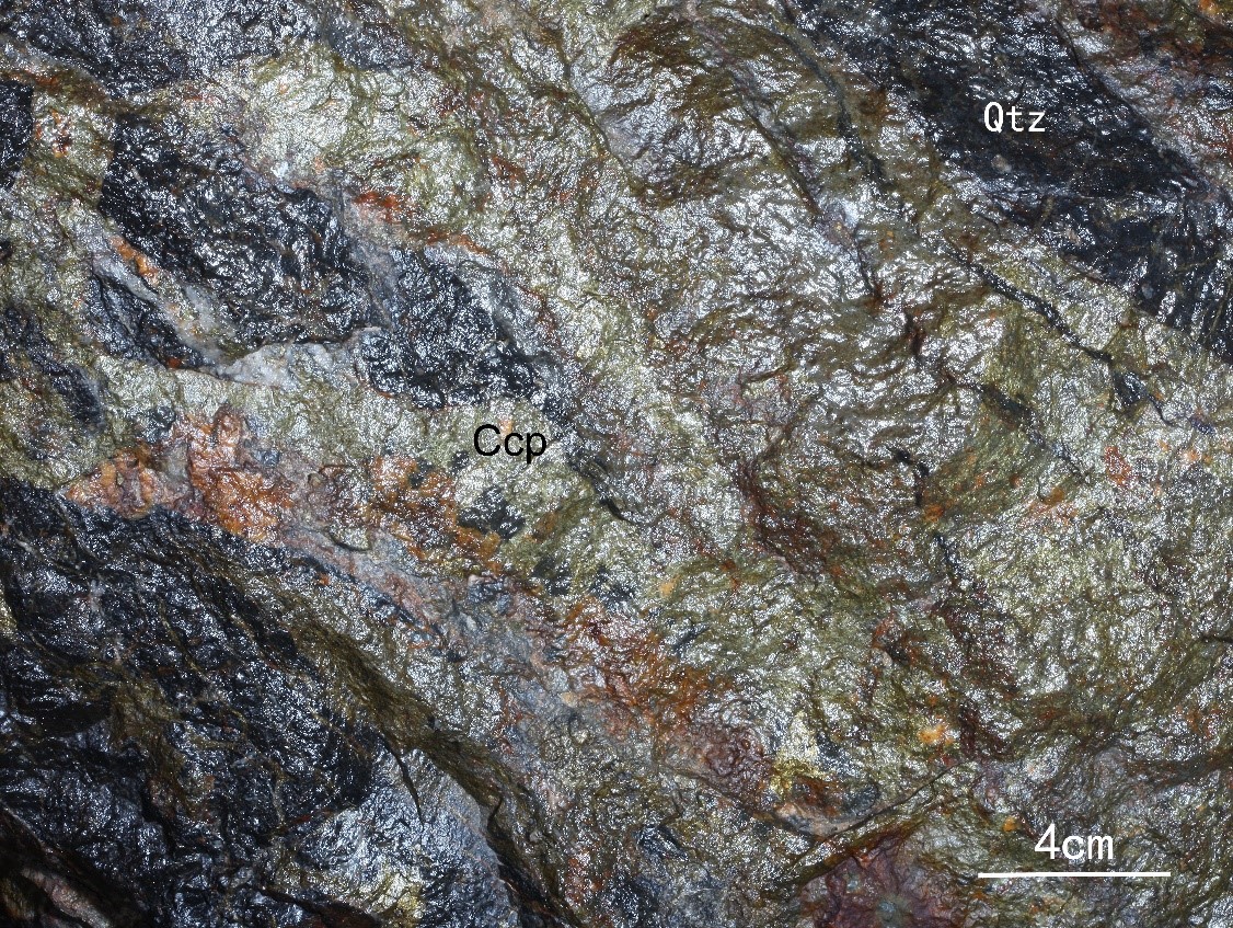 黄铜矿(Ccp)与石英(Qtz)共生,呈脉状分布。