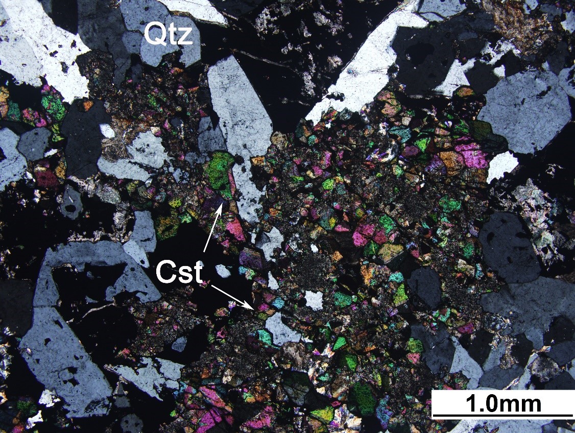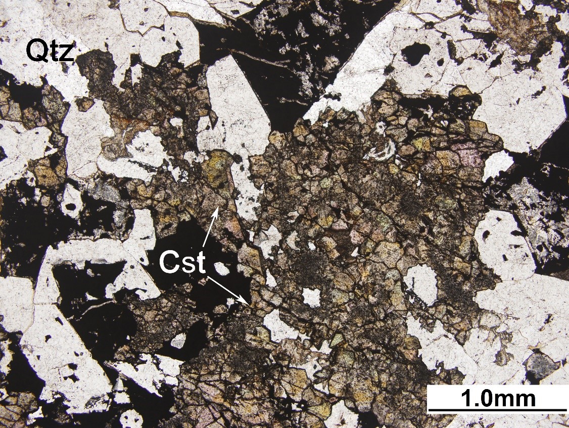 他形锡石(Cst)呈粒状分布于石英(Qtz)和黄铜矿(Ccp)周围,正交偏光下显示高级干涉色。石英晶形较为完好,呈长柱状。
