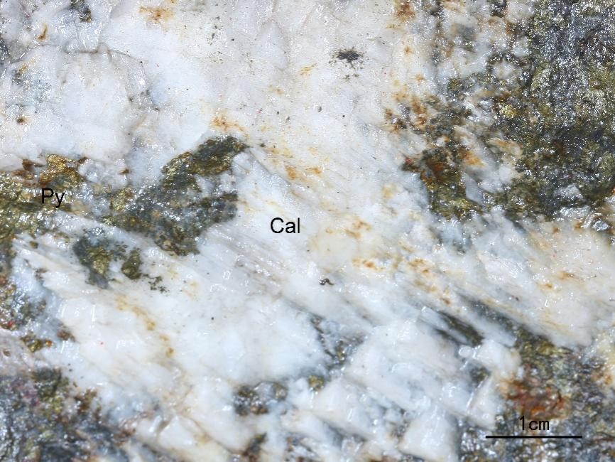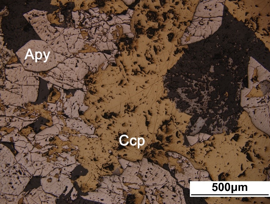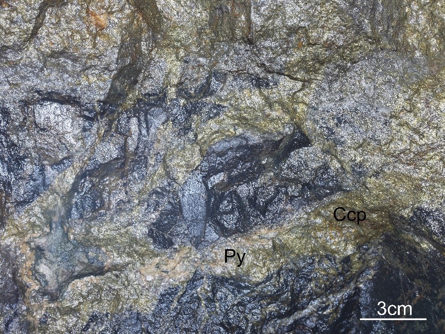 黄铁矿(Py)与黄铜矿(Ccp)共生,呈脉状分布于矿石中。