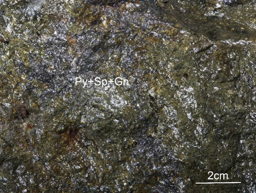 黄铁矿(Py)、方铅矿(Gn)与闪锌矿(Sp)共生。细粒粒状黄铁矿呈浸染状构造;方铅矿,铅灰色,带有台阶状的晶面条纹,浸染状构造;闪锌矿呈粒状分布。