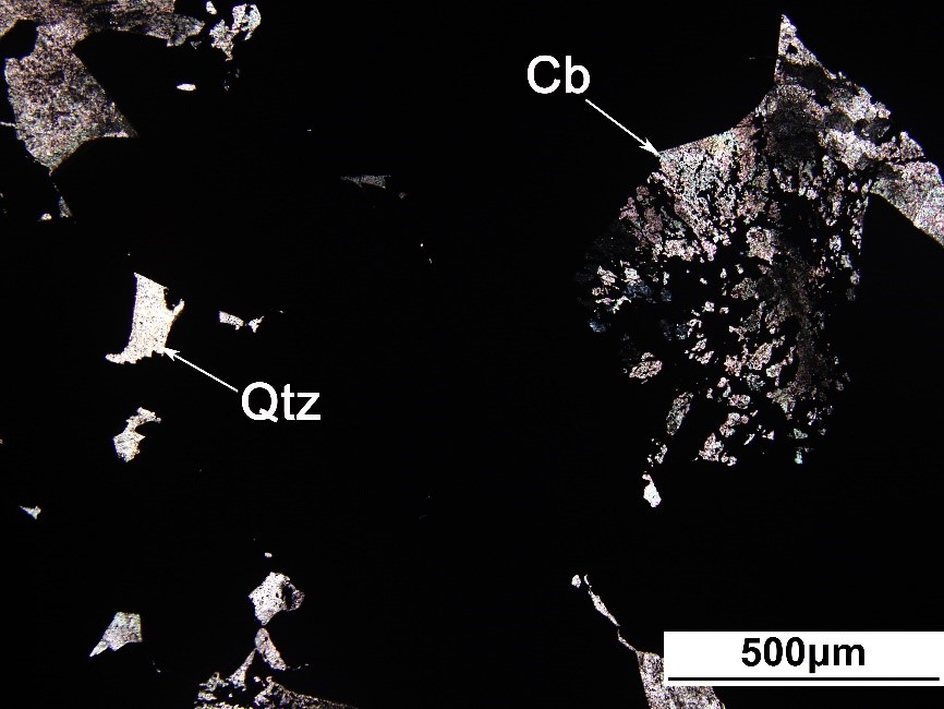 毒砂(Apy)与黄铜矿(Ccp)共生,颗粒间可见石英(Qtz)和碳酸盐矿物(Cb)。毒砂呈半自形至它形,正交偏光下显示强非均质性。