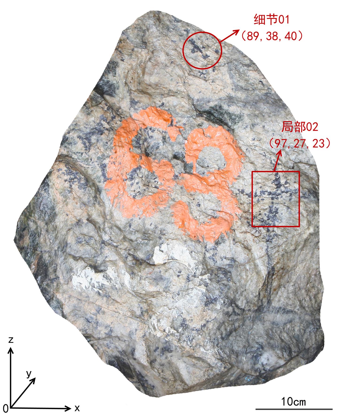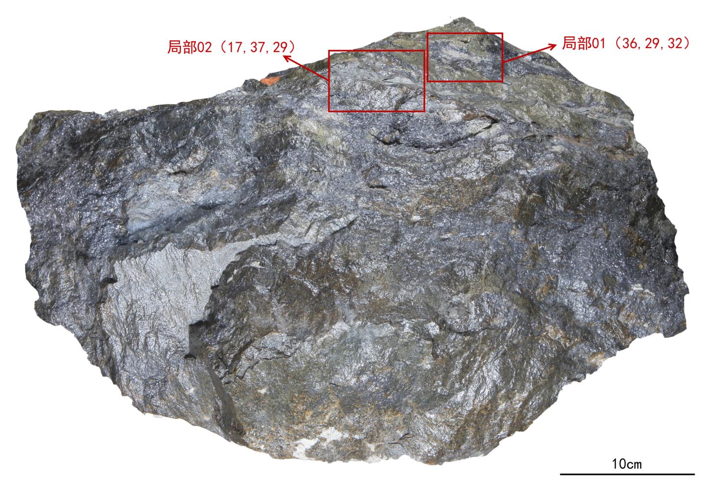 (2)钨锡钼铋矿矿石,产自湖南省郴州市东坡铅锌矿。矿石标本总体呈灰白色,部分位置呈灰红色,中细粒结构,浸染状—脉状构造。矿石矿物为辉钼矿、白钨矿、辉铋矿、方铅矿、闪锌矿、黄铁矿、黄铜矿;脉石矿物为透闪石、阳起石、长石、石英、方解石等。石英—长石网脉发育。可见绢云母化。所属矿床位于南岭构造带中段北缘,是著名的南岭多金属成矿带的重要组成部分。该区矿床类型复杂,矿化种类多,主要矿化有钨锡钼铋铅锌铜等。矿床三氧化钨品位0.17%,钼品位0.033% ,铋品位0.083% ,锡品位0.13%。
