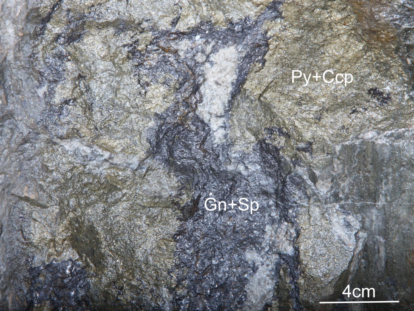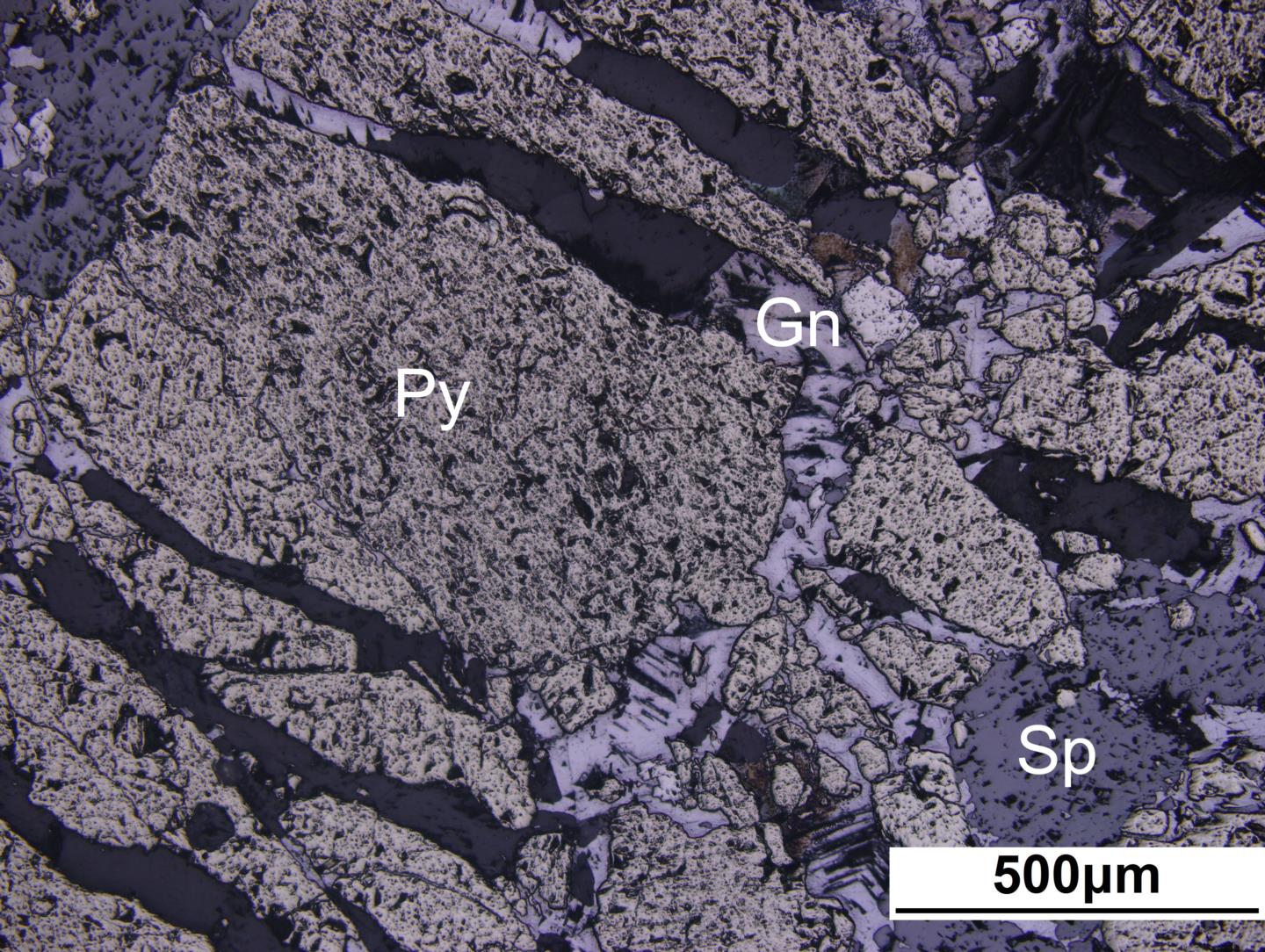 中细粒黄铁矿(Py)和黄铜矿(Ccp)两者密切共生,呈团块状分布于方铅矿(Gn)和闪锌矿(Sp)中。