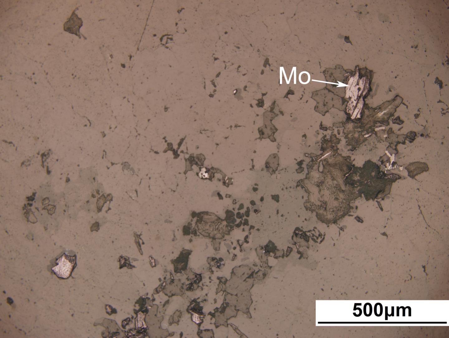 辉钼矿(Mo),弯曲片状、板状晶体,呈浸染状分布
