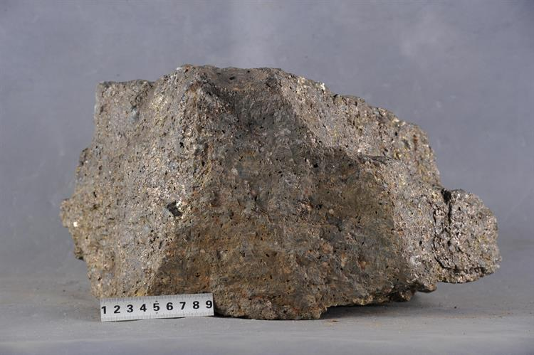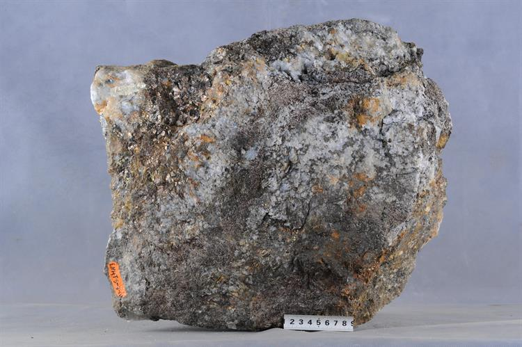 产自辽宁省清原县红透山块状铜锌矿标本呈灰褐色,中细粒粒状结构,浸染状构造,矿化均匀,主要矿石矿物为磁黄铁矿、黄铜矿、黄铁矿、闪锌矿等,主要脉石矿物为绿泥石、石英、黑云母、钾长石等。矿石矿物穿插于脉石矿物周围,几种矿石矿物密切共生。矿石表面可见半自形粒状的石英,难见到明显的绿泥石、云母等。矿石表面发育有火山喷发过程中形成的空洞。铜品位约为1.5 %、锌品位约为2.81%、银品位约为2.35克/吨。