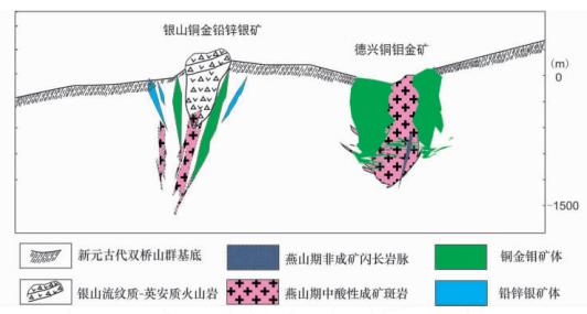 银山铜铅锌矿形成于中侏罗世,受控于银山火山机构。银山火山岩-次火山岩源区为新元古代形成富铜金铅锌银的下地壳物质。矿石具有明显的岩浆成因硫的特征,岩体和矿体具有相同的铅同位素来源,都表明了火山岩-次火山岩提供了成矿物质。成矿流体为火山-次火山热液,流体富含CO2,N2,CH4等挥发份,对成矿元素的迁移有重大的意义,流体运移到断层发育的部位,由于减压作用,流体迅速上升,引起温度骤降,同时伴随局部沸腾作用,导致成矿元素沉淀富集形成富矿脉。