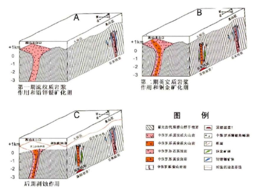 银山矿成矿期次可以划分为两期。早期铅锌银矿化,主要形成于北山区、九龙上天区、南山区,该期次矿化受到银山第一期流纹质岩浆作用控制。晚期的铜金矿化,主要形成于九铜区、银山东区以及西山区,该期次矿化受到银山第二期英安质岩浆作用控制。第三期的安山岩仅仅出露在西山区,为成矿后岩浆作用。在银山矿形成后,其经历了大约1Km的剥蚀作用,形成现在银山矿的形态。