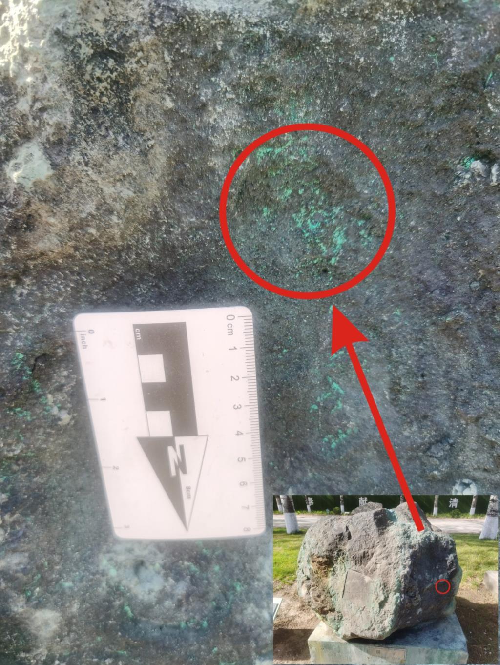 标本表面仿佛披上了一层朦胧的“绿纱”,别具一格。这层“绿纱”的主要成分是孔雀石,古称石绿、绿清、青琅轩,化学成分是碱式碳酸铜(Cu2[OH]2CO3),是由矿石标本上原生矿物蓝辉铜矿、铜蓝、斑铜矿等经风化蚀变而成的产物。