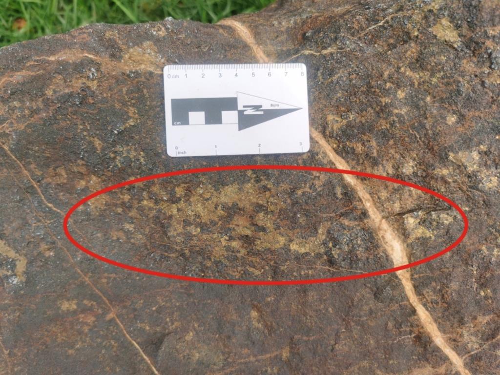 标本为矽卡岩型铜矿石,呈铁黑色,部分风化为黄褐色,中细粒状结构,浸染状构造。主要矿石矿物有黄铜矿、黄铁矿、斑铜矿、辉铜矿、磁铁矿、赤铁矿,脉石矿物主要有方解石、白云石、石榴子石、透辉石。